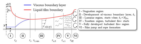 Figure 3 presents a sketch of different flow structures occurring in a perpendicular impinging liquid jet in a gaseous atmosphere. The flow field can be divided into several regimes. Near the impacting point on the workpiece surface, the fluid flow is described as the stagnation region, where the viscous boundary represents a constant value disregarding the distance to the jet center on the workpiece.