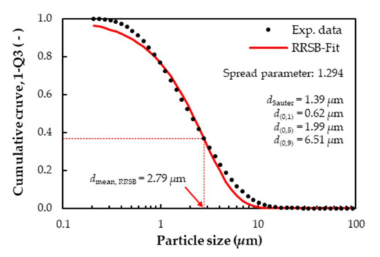 The effect of the fluid turbulence on the particle motion is considered using the stochastic discrete walk (DRW) model [49], in which the velocity fluctuations are included in the integration of the particle trajectories of each particle. The drag force on the particles is considered with the drag force model coefficient from Morsi and Alexander [50]. Proper particle size distribution is obtained from experimental measurements and correlated with a Rosin–Rammler–Sperling–Bennet (RRSB) function [51,52,53] to obtain the mean particle diameter, dmean,RRSB, and the spread parameter factor, which are applied as relevant parameters for the model setup. The RRSB parameters and the relevant particle information are presented in Figure 6.