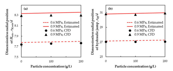 A comparison of the radial positions, where the minimum film height and the hydraulic jump occur between the results from the CFD simulations and the empirical equations, is presented in Figure 12. For the analytical estimation of these two characteristic positions, Equations (17) and (24) are used, respectively. A good agreement between these results is observed. The radial position corresponding to the minimum liquid height showed the most significant divergence, with a maximum absolute error of 0.65%, for the cases with an inlet pressure of 0.9 MPa (Figure 12a). The hydraulic jump position (Figure 12b) presented a maximum absolute error of 0.76% for the case of 0.6 MPa inlet pressure and particle concentration of 200 g/L (2.94 vol. concentration).