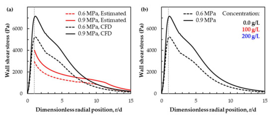 The radial position where the maximum wall shear stress is observed corresponds to the position where the maximum tangential liquid flow velocity is identified (Figure 14b). After that, the wall shear stress decreases, and at r/d ≈ 5, the curve profile shows a shoulder and thereafter decreases significantly up to r/d ≈ 8. This shoulder is also observed in the results from the empirical estimations but in the radial position further downstream, r/d > 10 (0.6 MPa) and r/d > 12 (0.9 MPa). Within the applied mathematical modeling, varying the particle concentration has no effects on the wall shear stress, and the curves of the shear stress profile overlap each other.