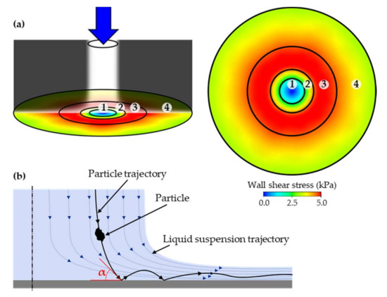 The effect of different particle concentrations of the fluid suspension and different operation pressures on the fluid behavior, fluid–workpiece interactions, and fluid–particle dynamics are investigated using CFD techniques. To validate the mathematical approach, a comparison with results of empirical/algebraic formulations is performed in terms of the fluid behavior, namely the fluid film and viscous boundary layer thickness and different radial positions where different phenomena occur inside the fluid flow. This validation is performed by using a 2D axisymmetric approach. Additionally, a fully 3D domain is applied to investigate the particle behavior in the regions close to the impingement zone.