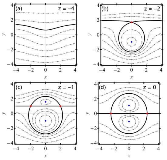 Phase portraits of the flow induced by a heton with on horizontal planes with (a) , (b) , (c) , and (d) . The legend remains the same as in Figure 2, except that the separatrix is given by , where is the value of the streamfunction at an unstable fixed point. No fluid is trapped sufficiently far away from the heton (a), but a finite trapping region bounded by a homoclinic separatrix is seen to exist upon increasing z (b). Further increase in z shows the presence of a heteroclinically bound trapping region (c). Finally, at , the trapping region is seen to be symmetric about the x and y axes, as in the case (d).