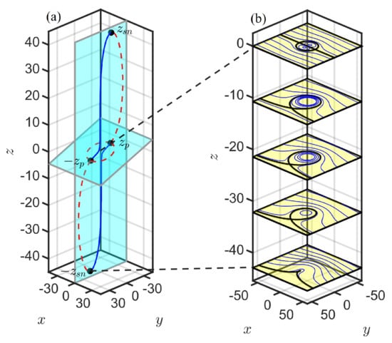 Bifurcation diagram (a) and contour slices (b) for the case. Panel (a) illustrates the generation/destruction of stable (solid blue curves) and unstable (dashed red curves) fixed points. At , a double saddle-node bifurcation leads to the creation of two pairs of fixed points. The stable pair is on the plane, and the unstable pair is on the plane. These fixed points are destroyed by another double saddle-node bifurcation at . The contour slices of panel (b) illustrate the three-dimensional volume trapped by the heton at five equally spaced planes between and .