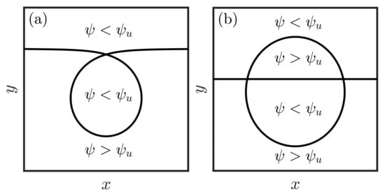 Schematic illustrating the geometry of the streamfunction values and the structure of the invariant manifolds at a fixed height z defining the trapped volume in the (a) homoclinic and (b) heteroclinic regime for . For , the structures are flipped across , and regions inside heteroclinic separatrices display the same pattern of streamfunction values, but regions inside homoclinic separatrices have . Here, is the streamfunction value at an unstable fixed point. Note that when , there is no homoclinic regime, the trapped volume is symmetric about all three coordinate planes, and .