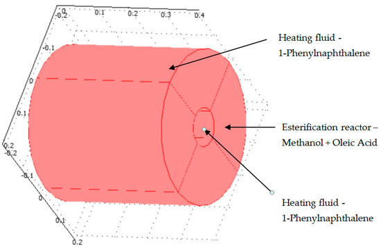 As can be seen from Figure 2, the phenyl-naphthalene liquid is heated by the fire heater. COMSOL Multiphysics software has been applied in this research and solved simultaneously the transient transport equations mass conservation (continuity), fluid flow (Navier–Stokes), energy, and diffusion with esterification reaction equations. Section 2.2.1 describes in detail the esterification reaction kinetics. Section 2.2.2 describes the continuity and fluid flow. Section 2.2.3 and Section 2.2.4 describe the energy transport and diffusion equations. The geometry of this reactor is shown in Figure 3.