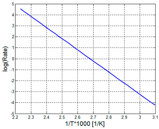 Figure 4 shows that the esterification reaction rate increases with the temperature. At 160 °C (0.0023 1/K), the reaction rate is about 55 [1/min].