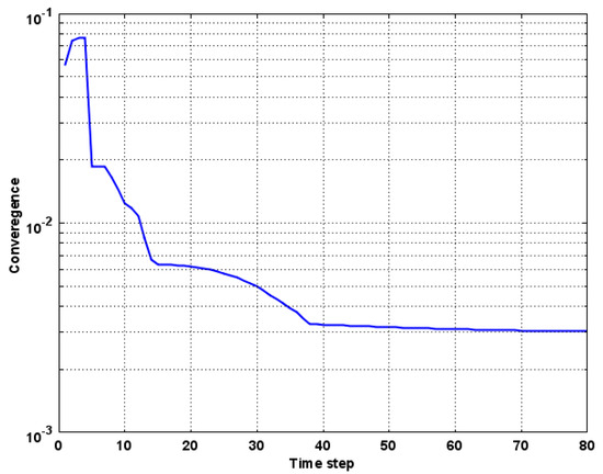 It was assumed that the temperature of the oleic acid and methanol entering the esterification reactor was 160 °C. In order to avoid the boiling and evaporation of the water generated during the esterification reaction, the pressure inside the esterification reactor was 700 kPa. It should be noted that the saturated pressure of water at T = 160 °C is 620 kPa [28]. Since the water droplets generated during the esterification reaction are heavier than the gas, they fall and are extracted from the reactor bottom. They may react with ionic liquid, mostly at the reactor inlet. Moreover, if the heating system fails (due to an electric power supply failure or technical problem inside the phenyl-naphthalene liquid pump), the steam may condensate inside the esterification reactor, leading to the generation of water bubbles and decreasing further the heat transfer to the esterification reactor. Thus, it may be difficult to resume the normal operation of the esterification reactor. By applying high pressure, it is easier to resume the operation of this reactor. In some cases, there are side reactions between water and ionic liquids [29]. To combat this problem, the water is removed. Figure 5 shows the convergence plot.