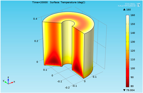 Figure 6 shows that the numerical errors of the concentration, velocity, and temperature have been decreased by 12 magnitudes (from 1 × 104 to 1 × 10−8). The maximal biodiesel yield obtained in the esterification reactor is 86% after 7200 s (2 h). This value is very similar to the experimental results obtained by Elsheikh et al. [11]. He performed experiments using an imidazolium ring. It was found that the best catalyst is 1-butyl-3-methylimidazolium hydrogen sulfate [BMIM][HSO4]. He achieved 91.2% conversion. The reaction temperature was 160 °C, and the reaction time was 2 h. Figure 7 shows the three-dimensional temperature field inside the esterification reactor at t = 20,000 s.