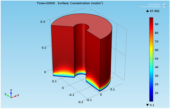 It can be seen from Figure 7 that the temperature at the lower section of the reactor is higher than the temperature at the upper side. This is because the endothermic esterification reaction consumes the heat provided by the phenyl-naphthalene liquid. It should be noted that the thermal conductivity of the ionic liquid and reactants (oleic acid and methanol) has a lower value. Figure 8 shows the 3D FAME concentration field inside the reactor.