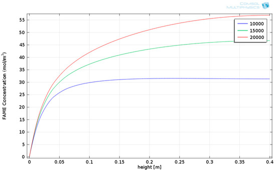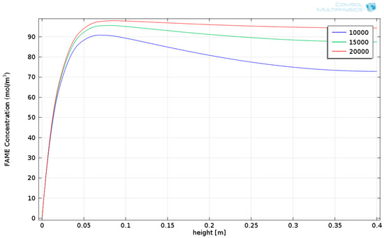 Figure 9 indicates that the oleic acid and methanol transformed almost completely to FAME (biodiesel) and water at t = 20,000 s. Figure 10 shows the axial FAME concentration along the reactor height.
