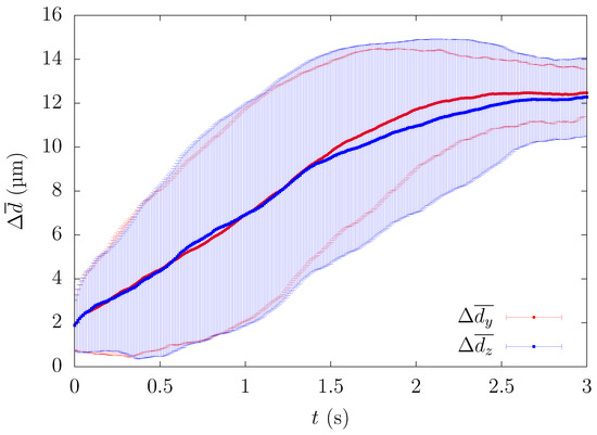 Figure 2 shows the time history of the ensemble-averaged distance between a particle and the centerline of the straight channel for , s and μm, μm, along with the error bars indicating the standard deviation. and represent the ensemble-averaged distances in the height and width direction, respectively. For example, if particles are entering the central square region of width H/4 and height H/4 and their y-position at time t is , the ensemble-averaged distances are described by the following equation,