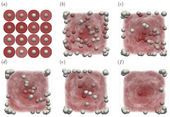 Snapshots of the simulation results in a straight channel of μm for s, at (a) t = 0, (b) t = 0.5, (c) t = 1.0, (d) t = 1.5, (e) t = 2.0, and (f) 3.0 s. The particles move gradually toward the corners of the channels.