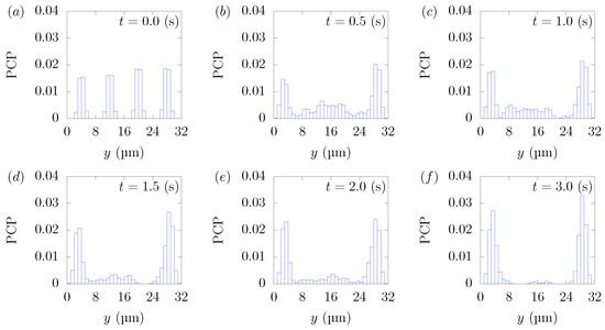 Particle Concentration Profiles (PCPs) in a straight channel of μm for s, at (a) t = 0, (b) t = 0.5, (c) t = 1.0, (d) t = 1.5, (e) t = 2.0, and (f) 3.0 s. Each graph corresponds to the results in Figure 3.