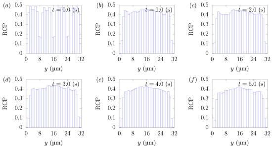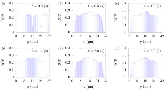 RBC Concentration Profiles (RCPs) in a straight channel of μm for s, at (a) t = 0, (b) t = 0.5, (c) t = 1.0, (d) t = 1.5, (e) t = 2.0, and (f) 3.0 s. Each graph corresponds to the results in Figure 3.