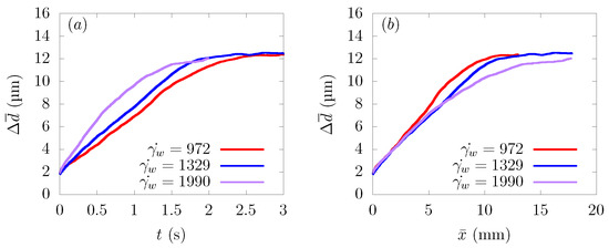 Figure 6a shows the time history of the average distance from the centerline , and Figure 6b represents the change of as a function of the distance traveled in the flow direction . As can be seen from Figure 6a, particles moved faster toward the wall direction at a higher shear rate.