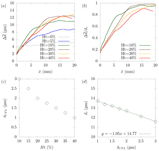 Numerical simulations were performed for hematocrit , , , , and to explore the relationship between hematocrit and its effect on particle margination. The wall shear rate in the plasma was 1910 s, and the same pressure gradient was applied in all cases. The simulated results were affected by many complicated factors, and it is not easy to discuss suitable dimensionless parameters. As shown in Figure 8c,d, the stable position for a particle, defined as the distance between the centerline and the center of the particle at equilibrium, varied with the hematocrit level. Another aspect is that rate of as a function of was not constant because the margination rate of the particles varied with the distance from the centerline. This was because the local shear rate and local hematocrit were different from the location in the plane. If we focus on the case of hematocrit = , the margination rate of was nearly constant up to μm, after which the margination rate slowed down. We confirmed that this region of the constant margination rate of was consistent with the RBC-core region.
