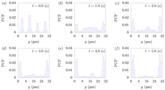 Particle Concentration Profiles (PCPs) in a straight channel of μm for s, at (a) t = 0, (b) t = 1.0, (c) t = 2.0, (d) t = 3.0, (e) t = 4.0, and (f) 5.0 s. Each graph corresponds to the results in Figure 9.