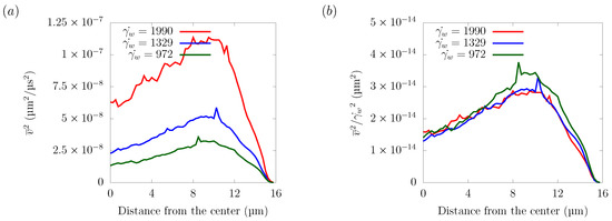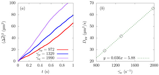 Since particles approached the wall direction and stayed in the corner of the square domain in the end, was not constant, so nor was , as we can confirm from Figure 12a. Therefore, we determined from the region where the change of was constant. The result is plotted in Figure 12b, and the average wall shear rate had a linear relationship with the diffusion coefficient . This result was supported by finding that the particle diffusivity is expressed as: