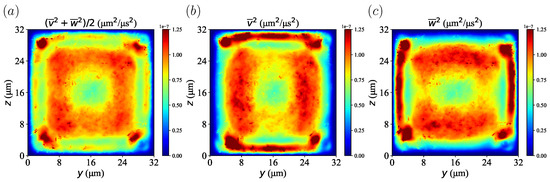 Velocity fluctuation calculated from time-averaged and spatially averaged velocity components from plasma in = 20% at s. (a) Velocity fluctuation from both the transverse y- and z-direction. (b) Velocity fluctuation of the y-direction. (c) Velocity fluctuation of the z-direction.