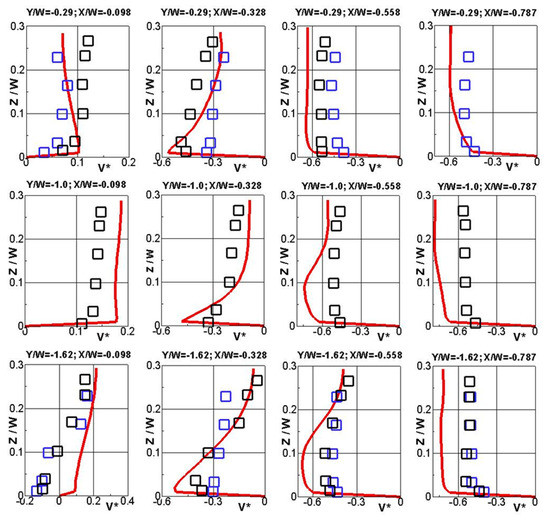 Comparison of v-velocity vertical profiles in the side channel at measured horizontal (xy) points; black symbols are the measured data from Ramamurthy et al. [3] while blue symbols are according to Qu [55].