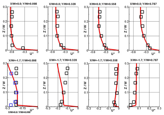 Comparisons of u-velocity vertical profiles in the main channel at measured horizontal (xy) points. black symbols are the measured data from Ramamurthy et al. [3], while blue symbols are according to Qu [55].