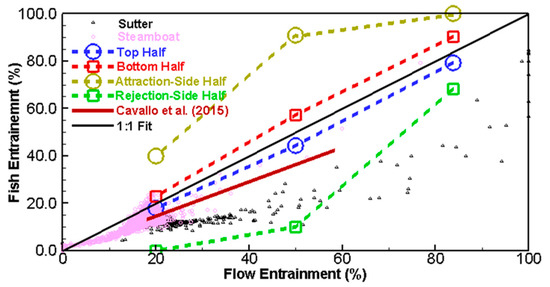Another feature is that both the computed and the field data entrainment curves displayed two distinctive slopes when the entrainment rate increases (see the non-entrainment-side scenario curve). This suggests that the fish entrainment rate would be accelerated once the flow diversion rate is above a threshold (about 50%). It is noticed that the slope of the measured data was less than the numerical model once the flow diversion rate was above 50%, which may be explained as follows: The Sacramento River experiences daily reversed flows (i.e., the period during which the mean flow is from downstream to upstream) during the flood period under the influence of the tide [28]. Flow entrainment above 50% occurs primarily during the reverse period at the site. Significant flow eddies are present when flow reverses and the average flow velocity is smaller than that at the normal flow [28]. Both may cause fish to respond to local flow velocity gradient in addition to the flow velocity, which may have led to the decreased fish entrainment at the juncture. The passive assumption may not be valid under the reversed flow condition.