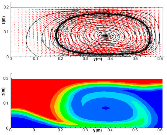 Predicted secondary flow (top) and Fish Distribution Function field (bottom) at the main channel cross-section 0.5 W upstream of the juncture for the vane case.
