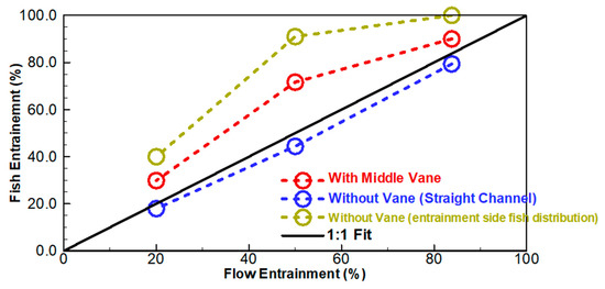 The simulation is carried out corresponding to the 20 T, 50 T and 84 T scenarios of the baseline case—i.e., the flow diversion rate is 20%, 50% and 83.8%, respectively. Fish is distributed with the top-half scenario at the channel inlet. The simulated flow velocity and FDF with the 50% diversion rate are plotted in Figure 11b, the predicted secondary flow created by the vane is shown in Figure 12, and the simulated fish entrainment rate is compared in Figure 13.