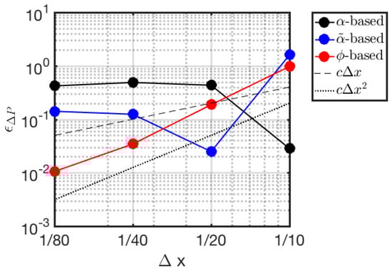 where is the discrete-time level and is the total number of time steps. The numerical prediction for each method is denoted by . As such, this error represents a time-averaged of the instantaneous deviation from the analytical solution. The results are shown in Figure 6 as a function of grid resolution, and a first-order reference line () is provided. The observation made previously is confirmed, where it is apparent that the -based method has a lower error magnitude compared with the other two methods. The convergence rate for all three methods is initially better than first-order accuracy but slows down at higher resolution levels. Interestingly, the standard -based case shows convergence even though, visually, the result does not appear to be encouraging.