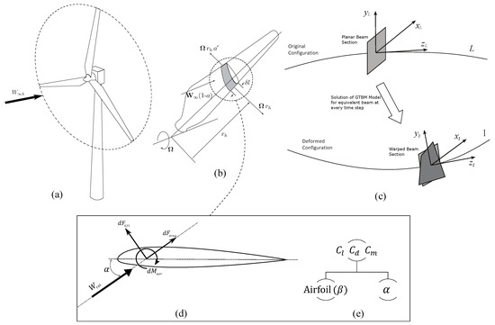 In Equation (3), denotes the transformation accounting for coning of the rotor, and performs a rotation around the pitching axis of the blade. These two transformations result in the blade coordinate system indicated by the subscript b as per the IEC standards [26]. For a detailed description of the concept of coning rotors see [27,28,29]. Consequently, the orthogonal matrix transforms the velocity of wind from blade coordinate system b to the non-deformed configuration system L, defined along the original reference line. Furthermore, the orthogonal matrix transforms from L to instantaneous deformed configuration system l, which is obtained from the solution of kinematic aspects of the structural model presented in Section 2.1. The intrinsic system L is aligned to the blade section in the chord-normal, chord-wise, and span-wise directions, and represents the longitudinal axis of the beam in its original configuration, as depicted in Figure 1c. In addition, denotes the blade section vibrational velocities coming from the structural model, and is the velocity associated with the motion of the blade section due to combined action of mechanical devices such as yaw, pitch, and azimuthal rotation. Both these velocity vectors are already expressed in the l system. As an example of all the transformations, the pitching rotation matrix is shown here,