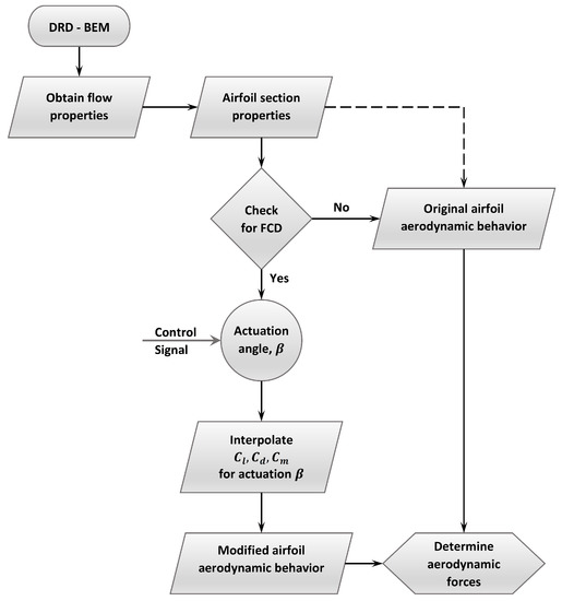 The control system module in CODEF currently has the ability to integrate the dynamics of control techniques such as yaw, pitch, and coning. Using trailing-edge flaps as a prototype, the module is extended with the capability to incorporate the dynamics of flow-control devices (FCD), simulating the interaction of such control actions with the dynamic aeroelastic response of the rotor. This means that the effects on the rotor dynamics due to a control decision from the FCD module and vice-versa will be evaluated at every instant of the simulation. In the example analyzed here, the aerodynamic characteristics of the modified airfoil sections fitted with fractional trailing-edge flaps are made available to the control module, which has the capacity to interpolate the instantaneous values of the aerodynamic coefficients from the repository of aerodynamic data. At each instant of the time-step analysis (see Section 2.2), the adaptive algorithm evaluates the level of actuation of the trailing-edge flap for each section of the blade, based on the instantaneous input from the control module. Then, each blade section adopts an updated value for its aerodynamic coefficients. The flowchart shown in Figure 6 gives an overview of functional algorithm that is used by the control system module of CODEF.