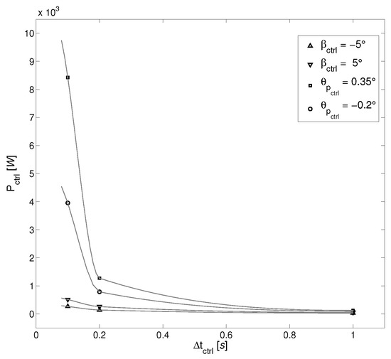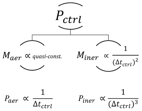 Referring to Figure 14, it can be observed that with increasing rapidity of control action (or decreasing ), the power required increases for both approaches. This increase is more pronounced for pitching action than for flap-actuation, and is associated with the higher inertia of the entire blade as compared to the short-span fractional-chord flap. Each of the NREL-5MW RWT blades weighs 17,740 kg [23] compared to a much smaller 28.1 kg of the flap used along -span of the blade in the current design. These inertial differences become significant due to a dependence on the time-span of control action . The power required to overcome the aerodynamic moment , and inertial moment have different dependencies on . While the aerodynamic moment remains quasi-constant for the consistent wind scenario that is being studied, the inertial moment depends on the rotational acceleration of the control device. This imposes a dependence for only on the rotational velocity of the control actuation to overcome , and an additional dependence on the acceleration of control actuation to overcome .