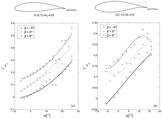 The coefficient of pitching moment at the actuation hinge depends on various factors such as the airfoil–flap configuration , instantaneous angle of attack , and the airfoil profile itself. Figure 8 presents coefficients of hinge moments computed for both NACA 643-618 and DU 93-W-210 airfoil sections with an attached -chord Clark Y profile trailing-edge flap, for a range of configurations relevant to the present work.