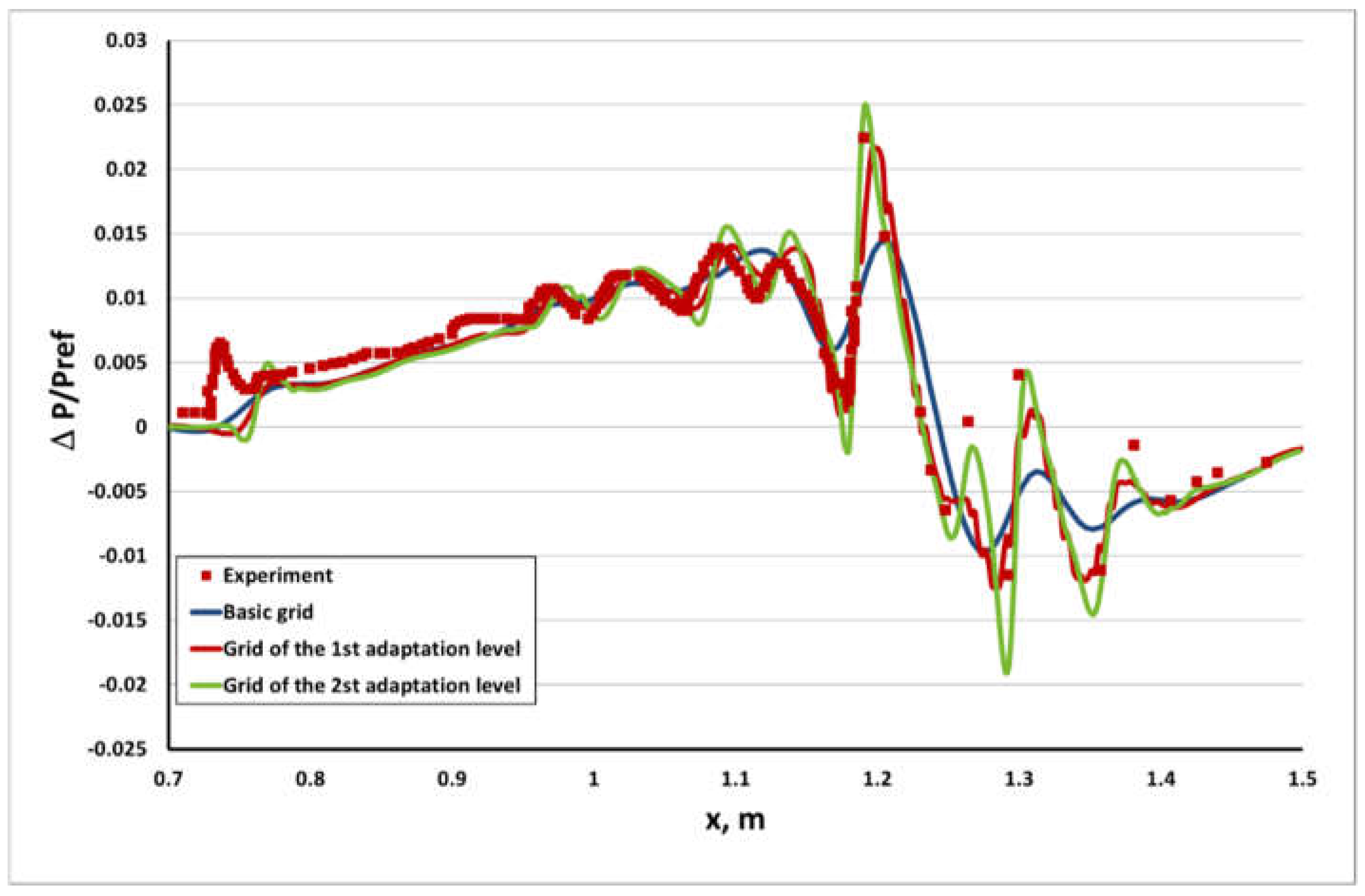 - The static adaptation algorithm provides efficient generation of a computational model that allows obtaining a more accurate solution owing to the local grid refinement in the shock-wave region and gaining the grid convergence of solution.