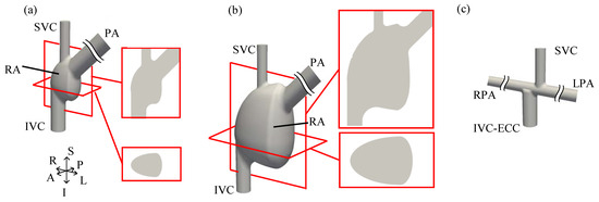 Idealized three-dimensional models of blood flow channels were developed for the anastomotic regions of the Fontan route in adults, which included the RA, inferior vena cava (IVC), superior vena cava (SVC), and pulmonary arteries (PAs) (Figure 1). An APC flow channel comprises the RA, IVC, SVC, and main PA. The APC Fontan was modeled for two types of RAs: normal-sized RA (APC-NRA) and dilated RA (APC-DRA). For the RAs, the maximum diameters in the anterior–posterior, left–right, and superior–inferior directions were 45.0, 35.0, and 62.5 mm [10,11,12,13] in APC-NRA, respectively; the diameters were doubled in APC-DRA. The RA’s cross-sectional shape was determined using two semi-ellipses with different diameters. The RA was set to be noncontractile, with the shape and length remaining constant throughout the cardiac cycle. IVC, SVC, and PA shapes were modeled as straight pipes with diameters of 22.0, 14.0, and 26.0 mm, respectively [14,15]; the lengths were 50.0 mm for both IVC and SVC and 150.0 mm for PA. The extracardiac conduit from the IVC (hereinafter called IVC-ECC) and SVC were connected to the left and right PAs in the TCPC model. Diameters were set as 22.0, 14.0, and 16.0 mm for IVC-ECC, SVC, and PA, respectively [14,16,17]; the lengths were 50.0 mm for both IVC-ECC and SVC, and 150.0 mm for PA, modeled as the straight pipes. Because the PAs in the TCPC model are the left and right PAs, whereas the PA in the APC is the main PA, the diameter of the PA is smaller in the TCPC model than in the APC model. The central axis of the SVC and IVC-ECC was offset by 18.0 mm in the left–right direction. At junctions between the RA, IVC or IVC-ECC, SVC, and PAs, the wall surfaces were chamfered with a 5.0–20.0 mm radius to make them smooth.