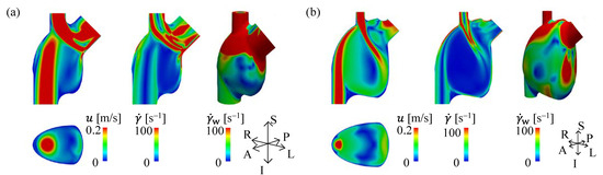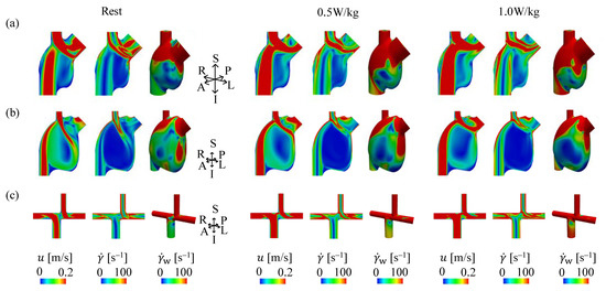 The flow rate increase in the IVC and IVC-ECC because of exercise led changes in blood flow compared with rest, as follows. The flow velocity increased in the distended portion of the RA (Figure 5a) in the APC-NRA and the PAs of the TCPC (Figure 5c). Consequently, SR and WSR increased overall in both the APC-NRA and TCPC models (Figure 6a,c and Figure 7a,c); the low SR volume and WSR surface area during moderate exercise were 4.6 cm3 (31% of the resting flow condition) and 1.2 cm2 (15%), respectively. However, in the APC-DRA, the strong mainstream from the IVC to the PA blocked the blood flow from SVC to the distended portion of the RA (Figure 5b). Therefore, the recirculating flow was enhanced to increase the low SR volume and low WSR surface area by, respectively, 1.06 (254.5 cm3) and 2.2 (27.2 cm2) times during mild exercise and 1.09 (261.8 cm3) and 3.1 (38.8 cm2) times during moderate exercise (Figure 6b and Figure 7b). Thus, in APC, the effects of IVC flow rate on RA blood flow differed between normal-sized and dilated RAs.