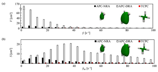 Histograms of (a) SR [s−1] and (b) WSR [s−1] in the anastomotic regions of the vena cava and pulmonary arteries. Green surfaces in the schematic drawings of the APC and TCPC models illustrate evaluation regions for this histogram. The class interval for both and was set as 5 [s−1], and corresponding volume [cm2] in (a) and wall surface area [cm2] in (b), as the frequency, were calculated at each or value.
