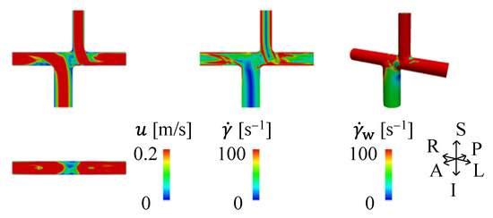 [m/s] in the coronal and horizontal cross-sections, shear rate (SR) [s−1] in the coronal cross-section and wall shear rate (WSR) [s−1] are shown from right to left.