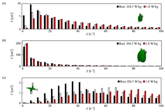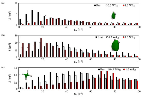 Histograms of SR [s−1] in three flow rate conditions of rest, mild exercise (0.5 W/kg), and moderate exercise (1.0 W/kg) for (a) APC-NRA, (b) APC-DRA, and (c) TCPC.