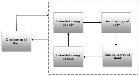 Therefore, in seeking to understand and explain pattern formation and self-organization, one must examine the “agent”, as well as the system in which it is embedded. Take, for instance, the example of a rigid object falling freely in a fluid medium (air, water, etc.), which will be discussed in further detail in the following section. The central object of attention is the rigid body, while the background environment is the fluid that must also be accounted for. As the rigid body falls in the liquid, it displaces the liquid, thereby activating the internal friction within, as the liquid moves. There is thermal disequilibrium in the system, between the boundary of the rigid body and fluid and parts of the fluid domain that are far away from the body. The feedback cycle of energy exchange plays itself out thusly: an increase in the kinetic energy of the body causes a change (say, drop) in the potential energy of the body, which is countered by a change (increase) in the potential energy of the fluid followed by a change in the kinetic energy of the fluid. This cycle continues until, in the steady state, the kinetic energies are maintained at a steady state, and only potential energy exchange participates as the cause of frictional heat loss. The movement of the body and fluid work towards bringing the system closer to thermal equilibrium (see Figure 1).