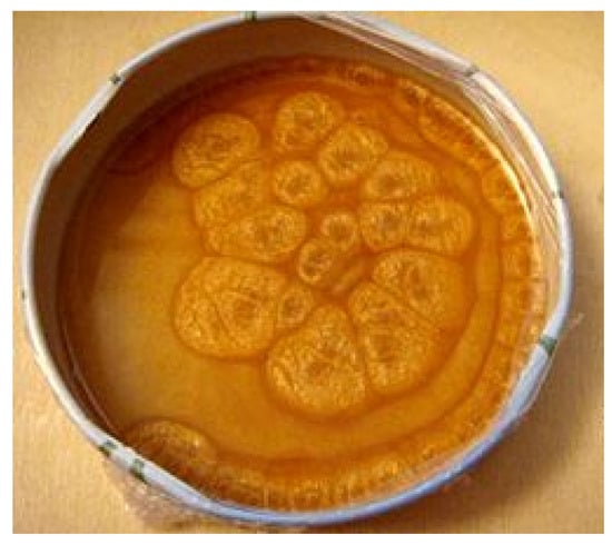 One problem of self-organization in fluid mechanics that has been studied extensively is the problem of Benard convection [36,37,38,39]. The out-of-equilibrium state of a fluid heated from below, upon sufficiently large departure from thermal equilibrium, results in convection in the fluid, giving rise to organized motion and the well-known Rayleigh–Benard cells on the liquid’s surface (see Figure 2). It has been argued that convective rolls serve the purpose of dissipating the excess thermal energy within the system, at the fastest rate possible, when the system is sufficiently far from thermodynamic equilibrium () [40]; below this threshold (), conductive heat transfer suffices. From a thermodynamic perspective, the particular mechanism of energy flow in systems not too far from thermal equilibrium has been described by the Constructal Law [40,41,42] as being “tree-like”, which is precisely how conduction is typically visualized. A comparison of the rate of entropy production (indicated as ) between conduction and convection shows that: