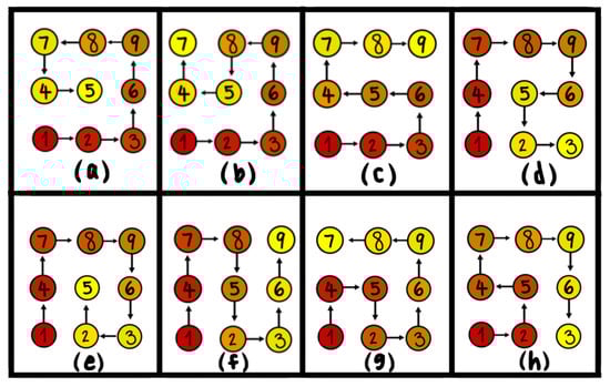 The panels (a–h) in this schematic present various possible Hamiltonian (non-overlapping) paths in a graph, starting at the cell ’1’. The darker cells indicate locations of greater energy. The path from dark red to orange to yellow indicates the arrow of time. The Table 1 reveals the number of such Hamiltonian paths for a general system.