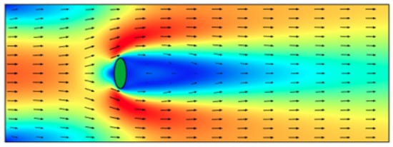 Symmetric bodies such as spheroids and cylinders, when moving in a Newtonian fluid, orient themselves in a steady configuration such that their longer axis is perpendicular to the direction of the flow (see Figure 4). This mechanical steady state depends on the shape, size, density of the rigid body, and nature of the surrounding fluid [45]. To probe further, we define a critical parameter, the Reynolds number () (the Reynolds number is given by the expression where is the density of the fluid, U is the characteristic velocity of the fluid, L is the characteristic scale, and is the dynamic viscosity of the fluid), which describes the competing effects of inertia to viscosity. Experiments have shown that in the case when , referred to as creeping flow (Stokes regime), any orientation of the body is permitted, i.e., there are infinitely many allowable configurations of the rigid body. However, there are critical Reynolds numbers, , , so that for , a symmetric body such as a cylinder or spheroid, orients itself with its longest axis perpendicular to the direction of gravity (or flow) [46]. However, as is increased beyond , the fluid–solid system becomes highly nonlinear, and the effect of inertia, as a result of vortex shedding (see Figure 5), is seen to give rise to bifurcations from the steady orientation to periodic oscillations [46], which eventually leads to autorotation, i.e., complete and sustained flow-induced rotation.