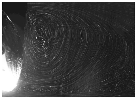 This experimental figure shows a two-dimensional slice of the wake vortex structure formed behind a spheroidal body. The wake is illuminated using a a laser sheet, which is scattered by the micron-sized glass powder, which seeds the fluid, thereby illuminating and revealing the vortex spiral. This can be thought of as a zoomed-in image of the computational wake image shown in Figure 4.