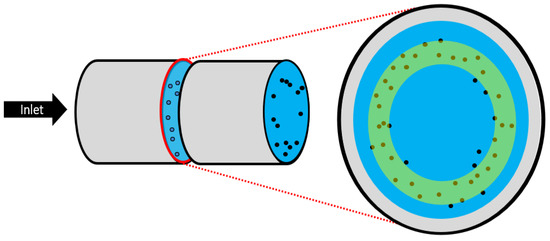 The existence of a translational force toward the boundary of flow would suggest that all sedimenting particles tend toward the boundary and would quickly crash into the wall. However, a “wall effect” felt by particles near the boundaries of flow allow particles to settle in an equilibrium position away from the wall. This near-wall interaction is mostly driven by the viscous property of fluids in the vicinity of the boundary. Many studies have shown the potential for varying equilibrium positions, dependent mostly on the viscous properties of the fluid. Groups of sedimenting particles and particles of varying size have equilibrium positions within the Segré–Silberberg radius [52]. In a neatly constrained system such as a pipe, particles are seen to suspend in stable positions in the Segré–Silberberg radial band (as shown in Figure 6).