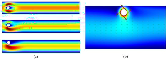 Panel (a) depicts the results of our numerical computation of the pressure gradients surrounding the model of a sedimenting particle; (b) numerical computation of fluid velocity fields surrounding a sedimenting particle. The color scheme in (a) represents the flow speed, with blue corresponding to zero speed and red to the maximum speed. Flow velocity at the channel walls are taken to correspond to no-slip velocity, while perfect slip conditions are prescribed on the boundary of the cylinder.
