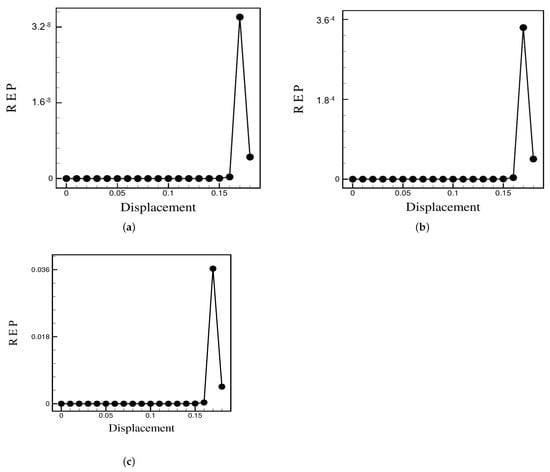 The exchange of kinetic and potential energies in the fluid flow can adequately define the rate of entropy production, as shown in previous work [31], as it satisfies three key conditions: (i) is positive over the entire domain; (ii) 0 as the Reynolds number tends to zero in the reversible, Stokes case; (iii) satisfies Onsager’s reciprocity relations [30]. The results for a particle of radius of 0.024 m for various Reynolds numbers are shown in Figure 8. Displacement is equal to zero in the center of the channel. Here, we see a peak in the REP when the particle is placed within the Segré–Silberberg radial band.