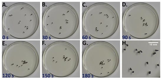 An example of flocking. The panels (A–H) show the time evolution of the development of a flock with 15 irregular BQ particles. Reprinted with permission from Satterwhite-Warden, J.E., Kondepudi, D.K., Dixon, J.A. and Rusling, J.F., 2019. Thermal-and Magnetic-Sensitive Particle Flocking Motion at the Air–Water Interface. The Journal of Physical Chemistry B, 123(17), pp. 3832–3840. Copyright 2019 American Chemical Society.
