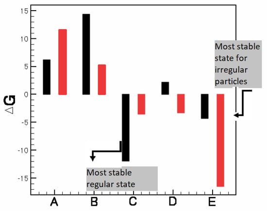 This graph shows the change in the Gibbs free energy for the various flock sizes for regular (black) and irregular (red) BQ particles. is required for the stability of the configuration with the most stable state corresponding to the most negative. It is clear that in the case of regular particles, the most stable are the mid-sized “C” flocks, while the irregular particles tend towards the larger, “E” flocks.