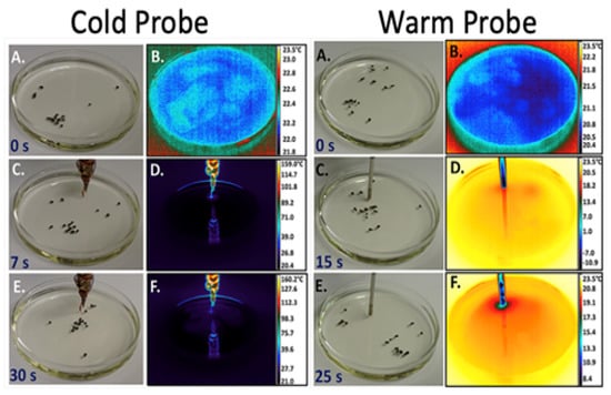 The two columns of panels on the left show the response of a flock to the introduction of a cold probe (Panels A, C, and E) and corresponding thermal images (Panels B, D, and F). The two columns of panels on the right show the response of a flock to the introduction of a warm probe and corresponding thermal images. Reprinted with permission from Satterwhite-Warden, J.E., Kondepudi, D.K., Dixon, J.A. and Rusling, J.F., 2019. Thermal-and Magnetic-Sensitive Particle Flocking Motion at the Air–Water Interface. The Journal of Physical Chemistry B, 123(17), pp. 3832–3840. Copyright 2019 American Chemical Society.